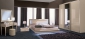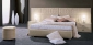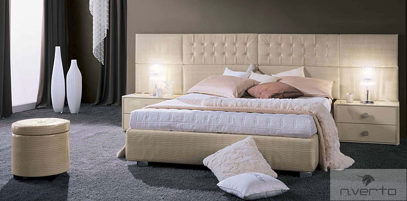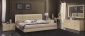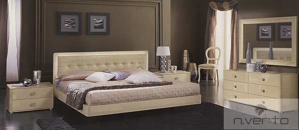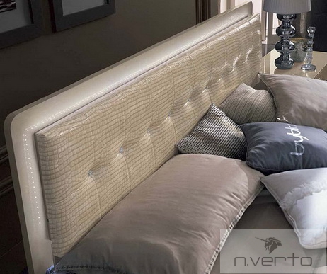 Cпальня изготавливается в отделке бежевым лаком и лакированой экокожей, стилизованой под кожу каймана. Светодиодная подсветка кровати снизу даёт эффект "парящего ринга". Кровать также может комплектоваться ящиком для белья, при этом периметр кровати изготавливается мягким в отделке из экокожи.   Изголовье кровати стандартно имеет светодиодную подсветку. Изголовье может быть 2-х видов: дерево с отделкой бежевым лаком или с мягкой частью из экокожи, украшеное стразами "Сваровски", и лакированым периметром. Концептуально новое изголовье "Moon" состоит из нескольких модульных панелей. Количество и тип панелей можно выбрать индивидуально. Возможно украшение такого изголовья стразами "Сваровски". Данное изголовье выполняется в мягкой обивке из лакированой экокожи, очень приятной на ощупь.